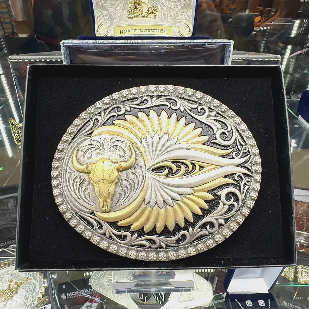 Bold, rugged, and rooted in Western tradition. This Sturgis buckle showcases a detailed buffalo skull in a circular motif on one side and a striking blend of gold, silver, and black tones on the other. Heavy antiquing adds a timeworn character, while the classic berried edge frames the design with timeless grit. Whether you're in the saddle or just carrying that frontier spirit, this buckle brings the West with you. Standard 1.5 inch swivel.